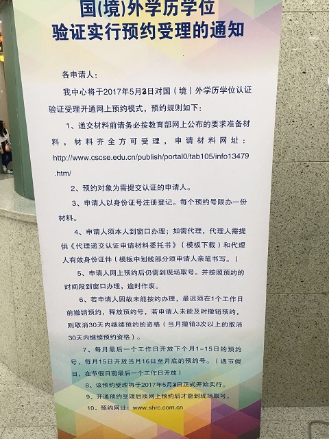 上海學歷認證服務中心將于2017年5月2日對國(境)外學歷學位認證驗證受理開通網上預約模式,預約規(guī)則如下: